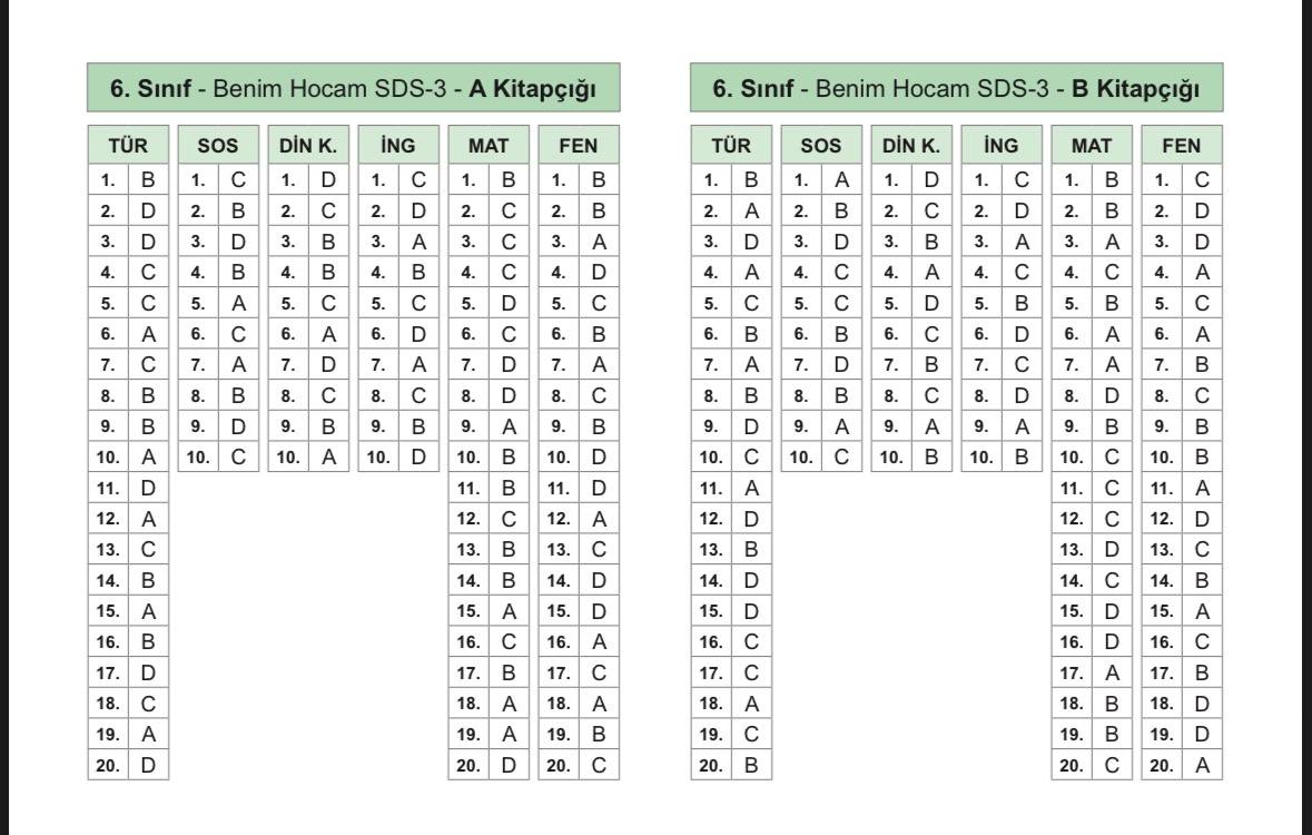 2025-2026 6. Sınıf Benim Hocam Yayınları 3. Deneme Sınavı Kurumsal Cevap Anahtarı