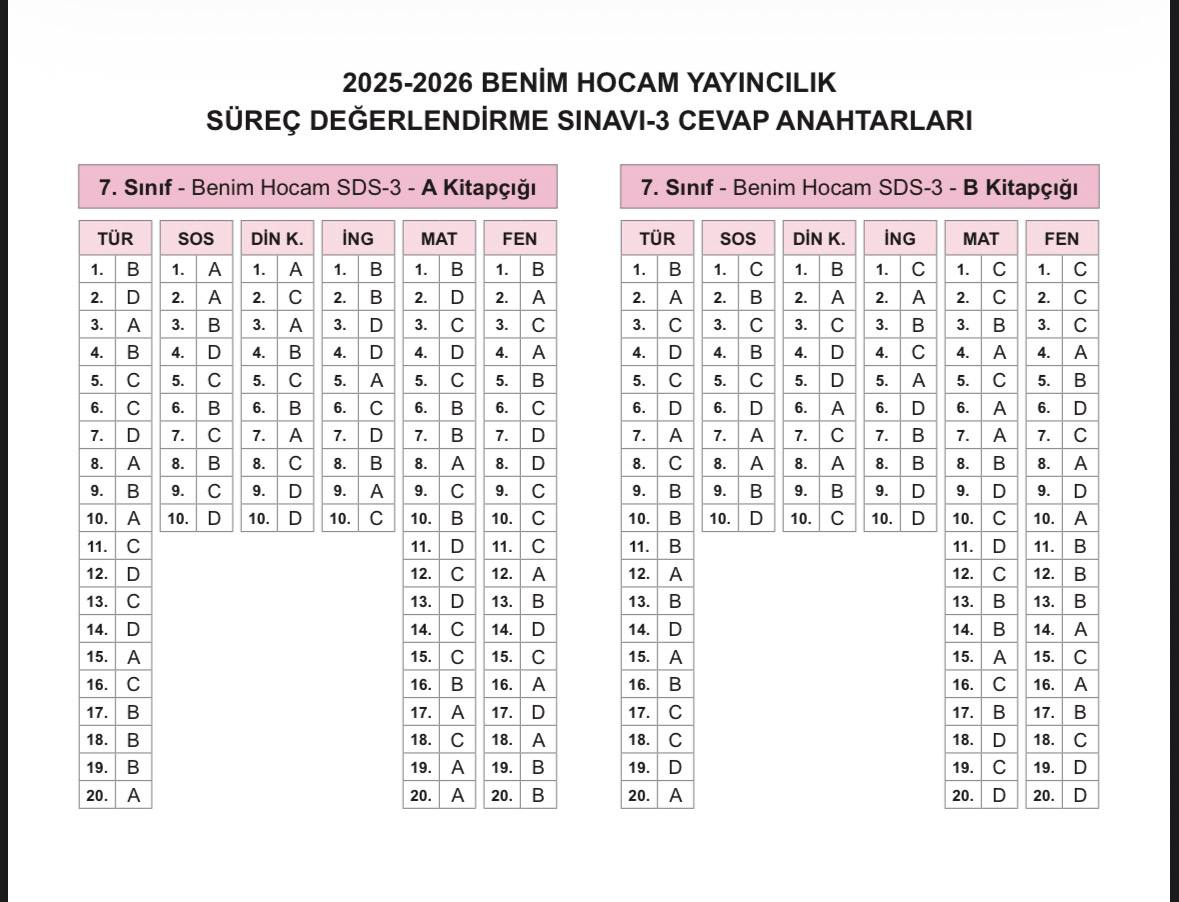2025-2026 7. Sınıf Benim Hocam Yayınları 3. Deneme Sınavı Kurumsal Cevap Anahtarı