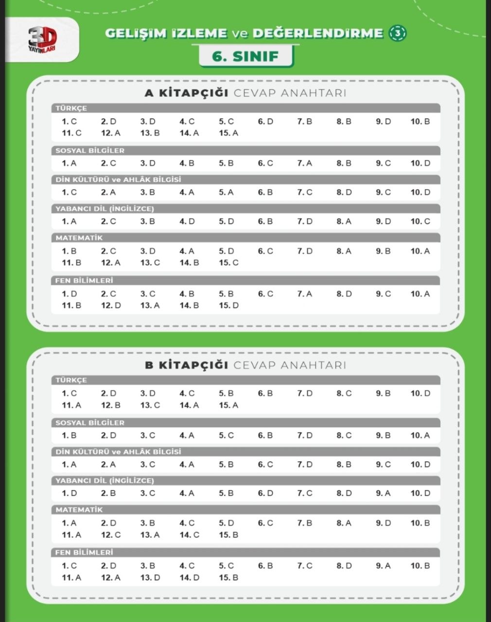 2025-2026 6. Sınıf 3D Yayınları 3. Deneme Sınavı Kurumsal Cevap Anahtarı
